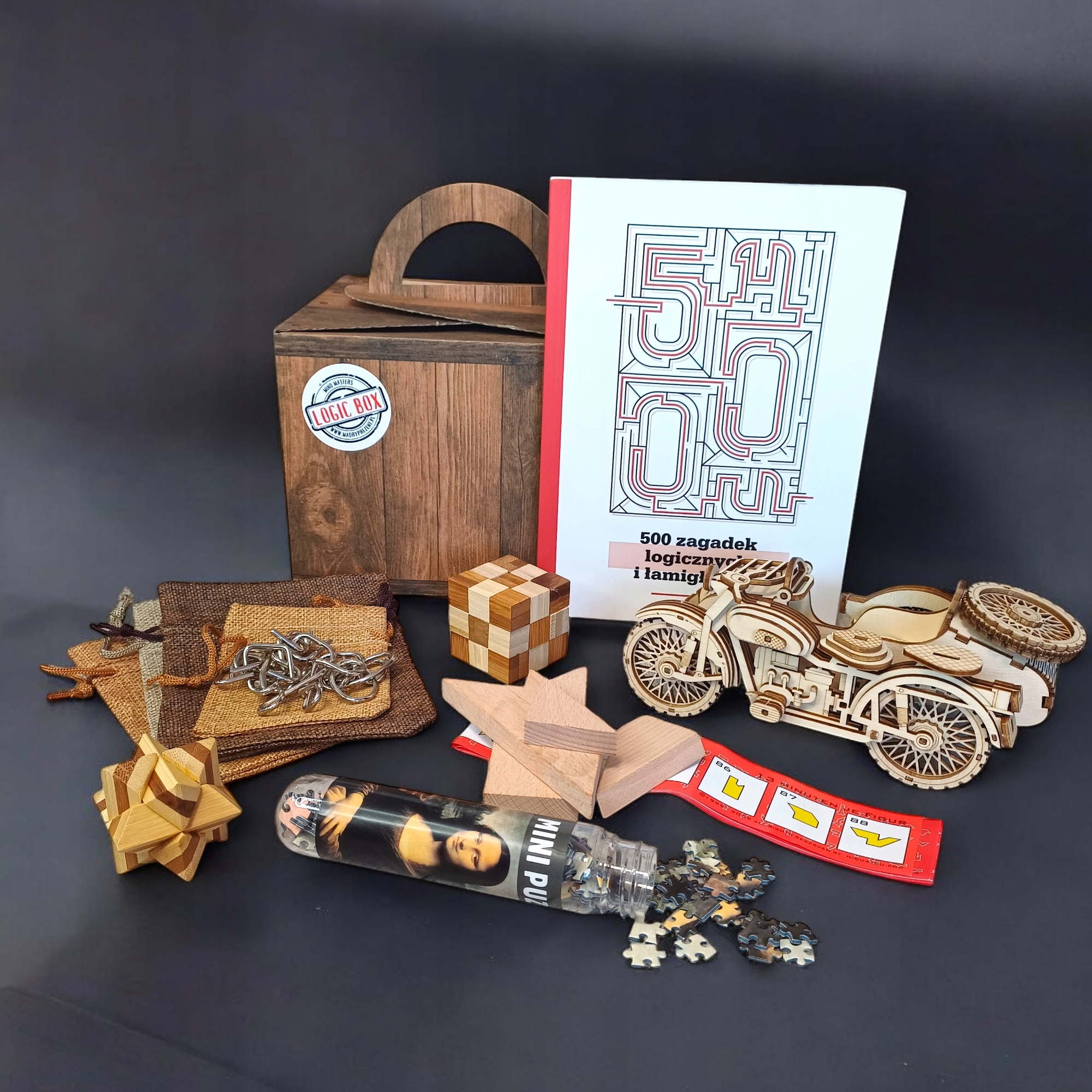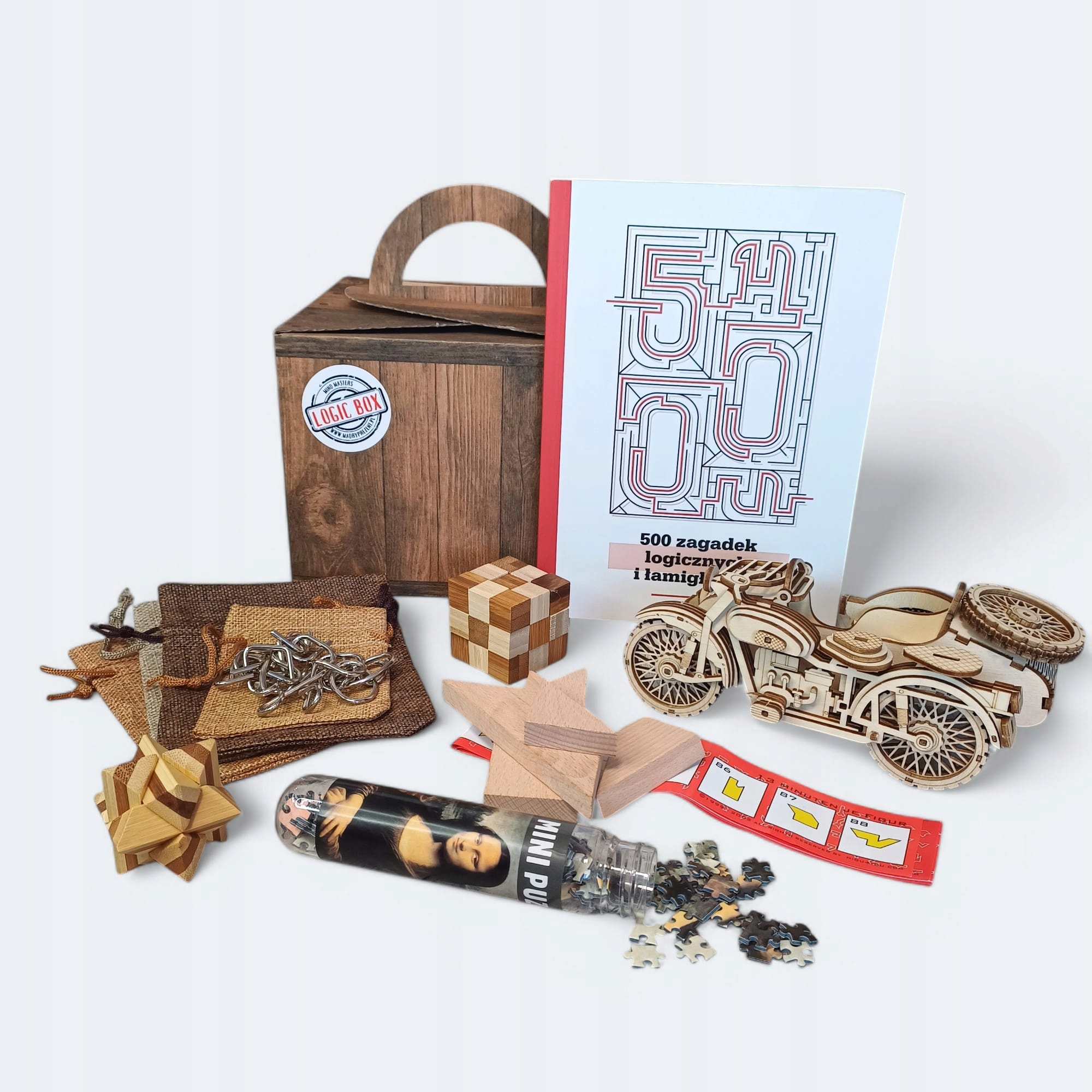 Zestaw zawiera książkę, 6 drewnianych łamigłówek + box w stylu Vintage.